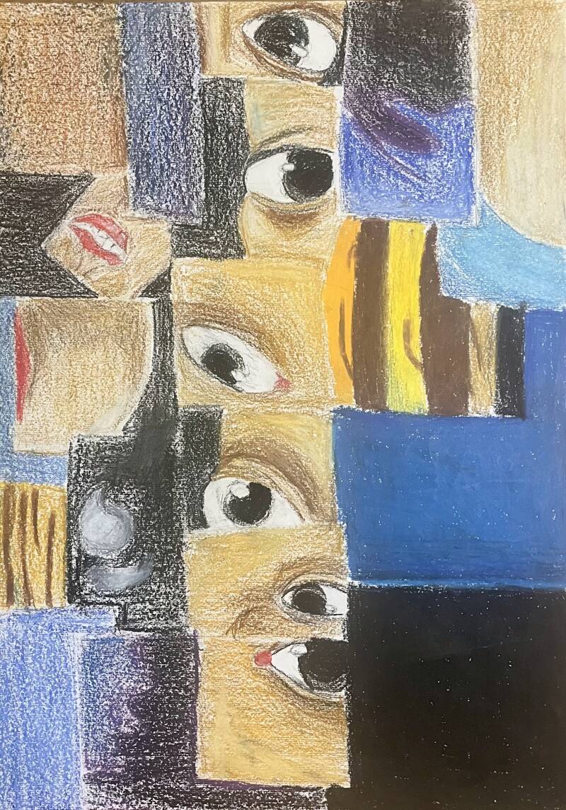 Mein farbigstes Bild ist auf jeden Fall dieses hier. Dabei habe ich darauf geachtet, dass im Hintergrund immer eine Komplementärfarbe zur Vordergrundfarbe steht. Es war hauptsächlich eine Übung für Farbkombinationen und Doppelbuchstaben. Zusätzlich habe ich hier die Fluchtpunkttechnik angewendet, die ich neu entdeckt habe.